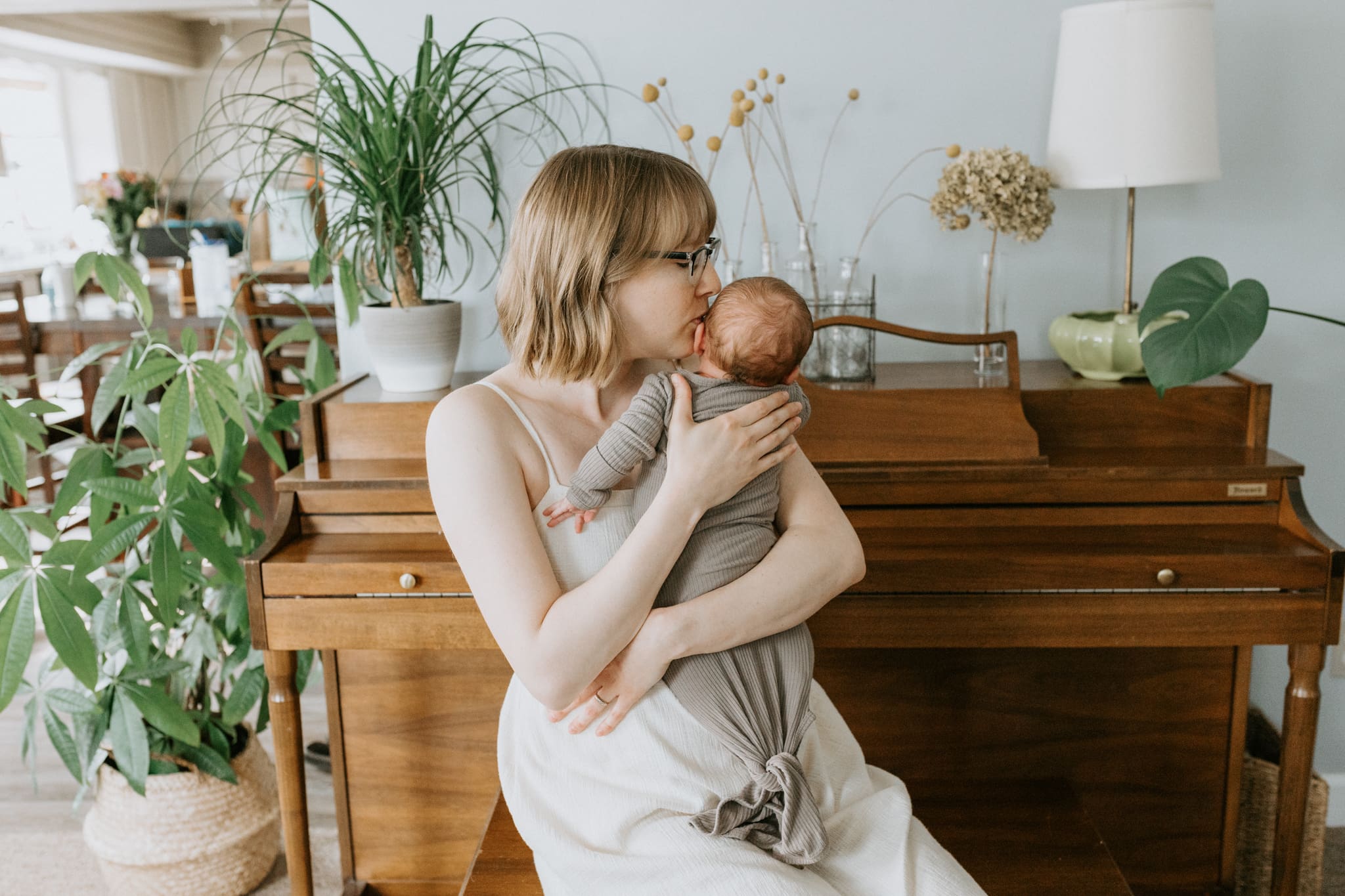 I do not currently have a studio space in the area, so 100% of my newborn work is in my clients’ homes. My clients say they book me because they love the natural connection in my photos that don’t feel stiff or overly posed, and a studio space doesn’t give us the relaxed, calm environment needed to create those feelings. I know it can feel a bit stressful having someone into your home right after having a baby, but all I need to work with is a couple of rooms that have good window light (usually a bedroom and living room). It’s much more normal than not that my clients have messy kitchens, laundry in piles, and spaces that aren’t perfectly put together.